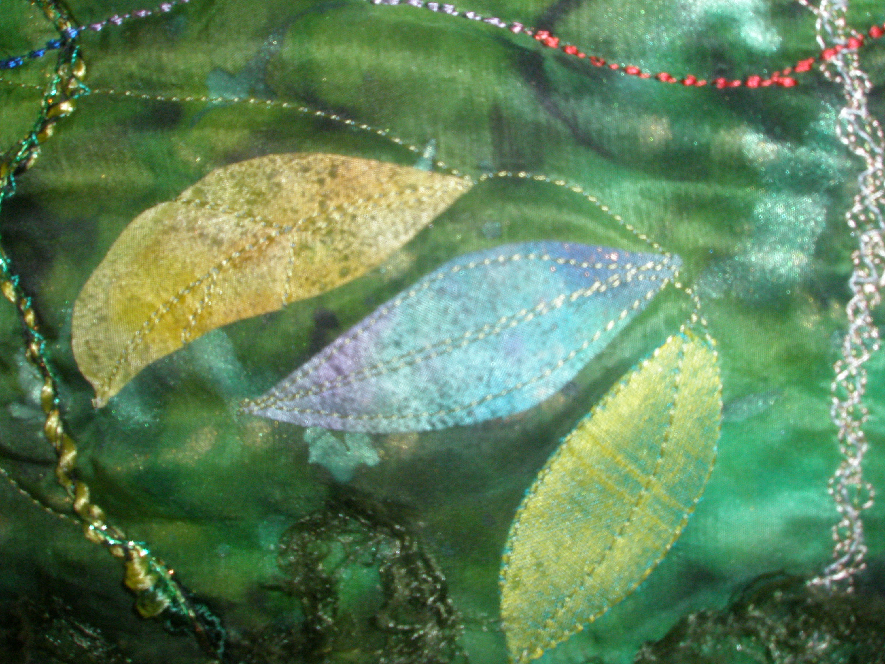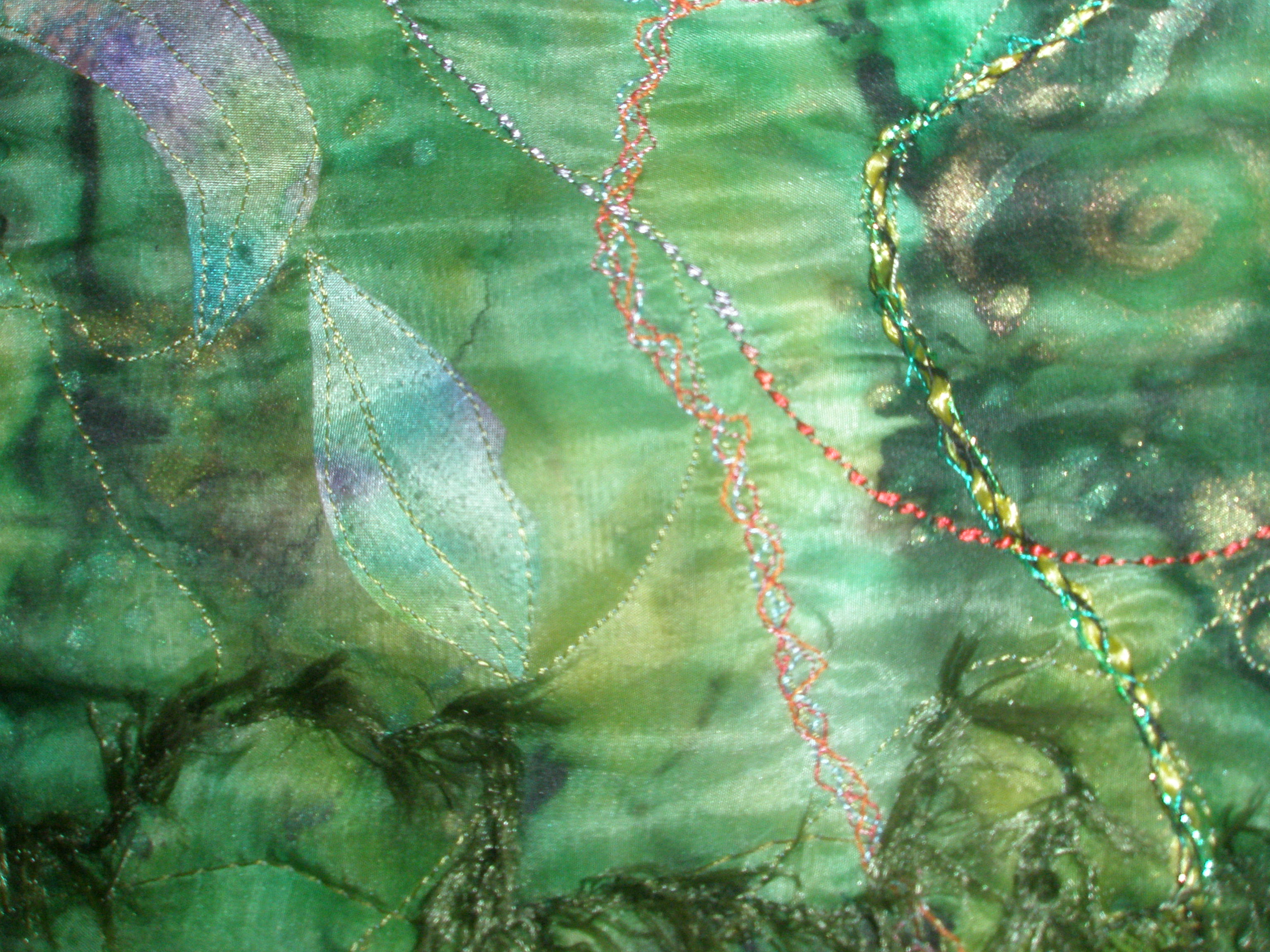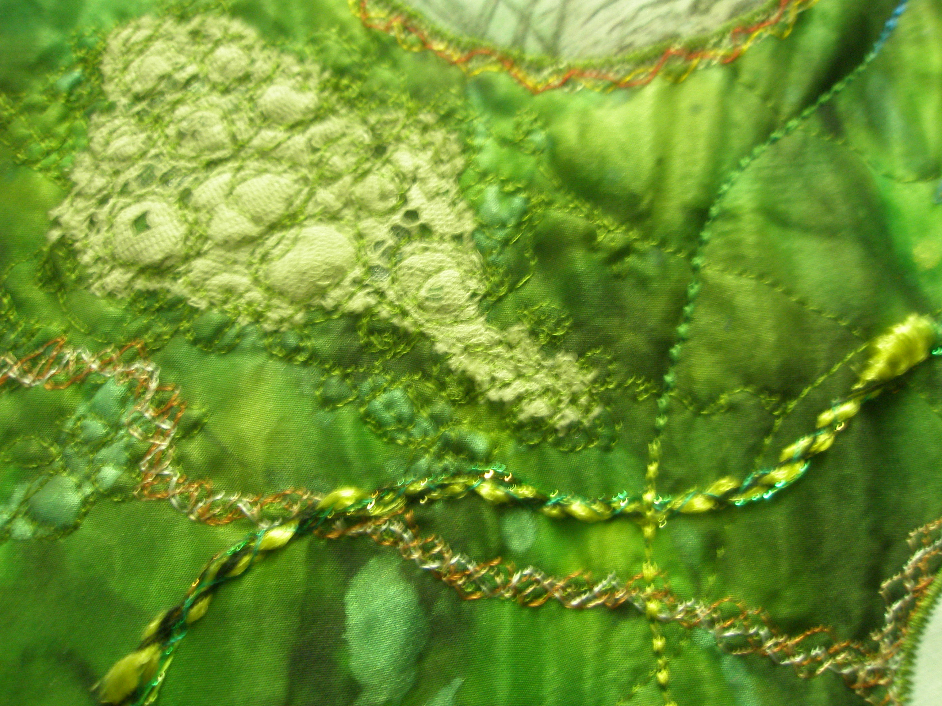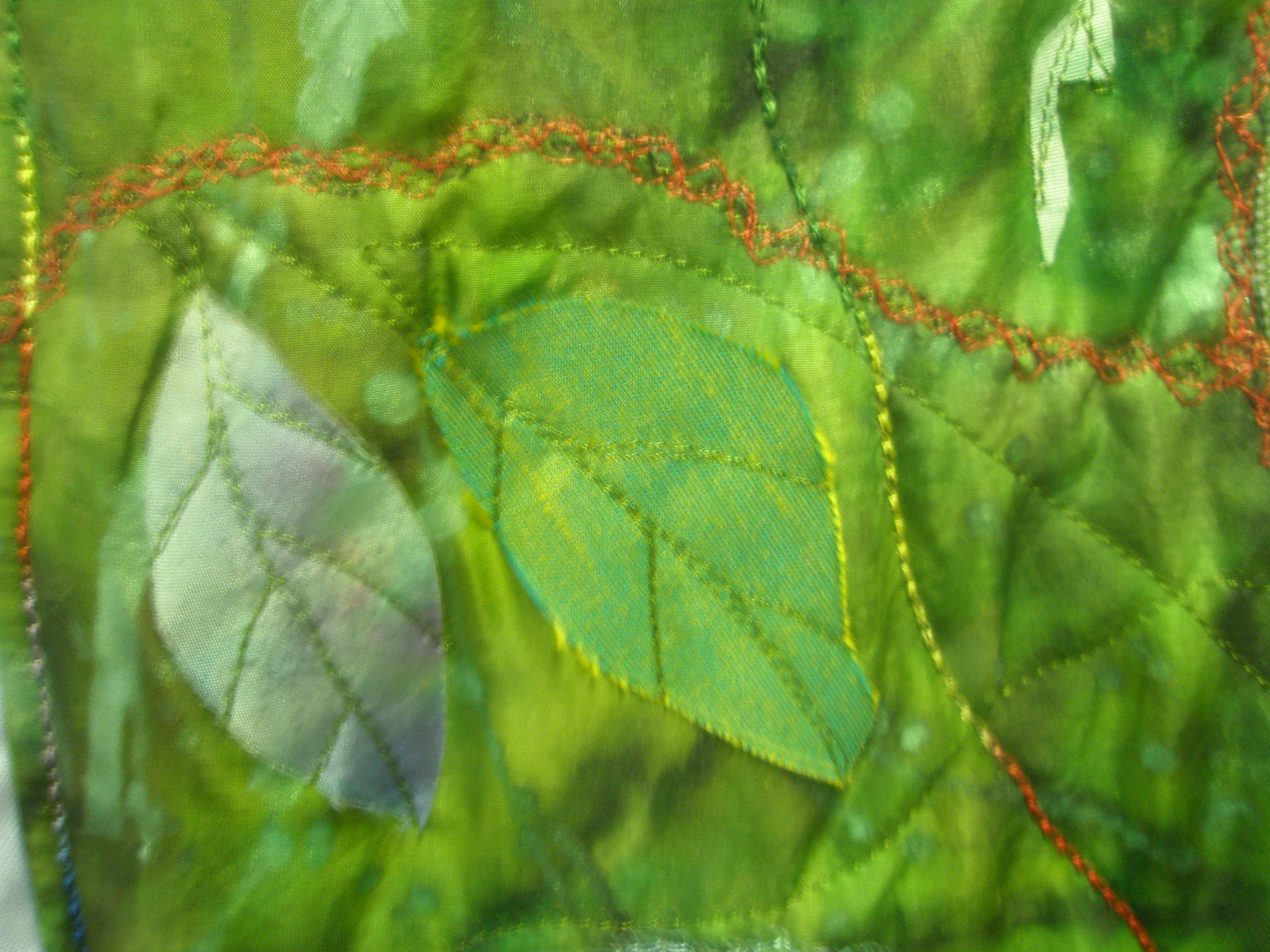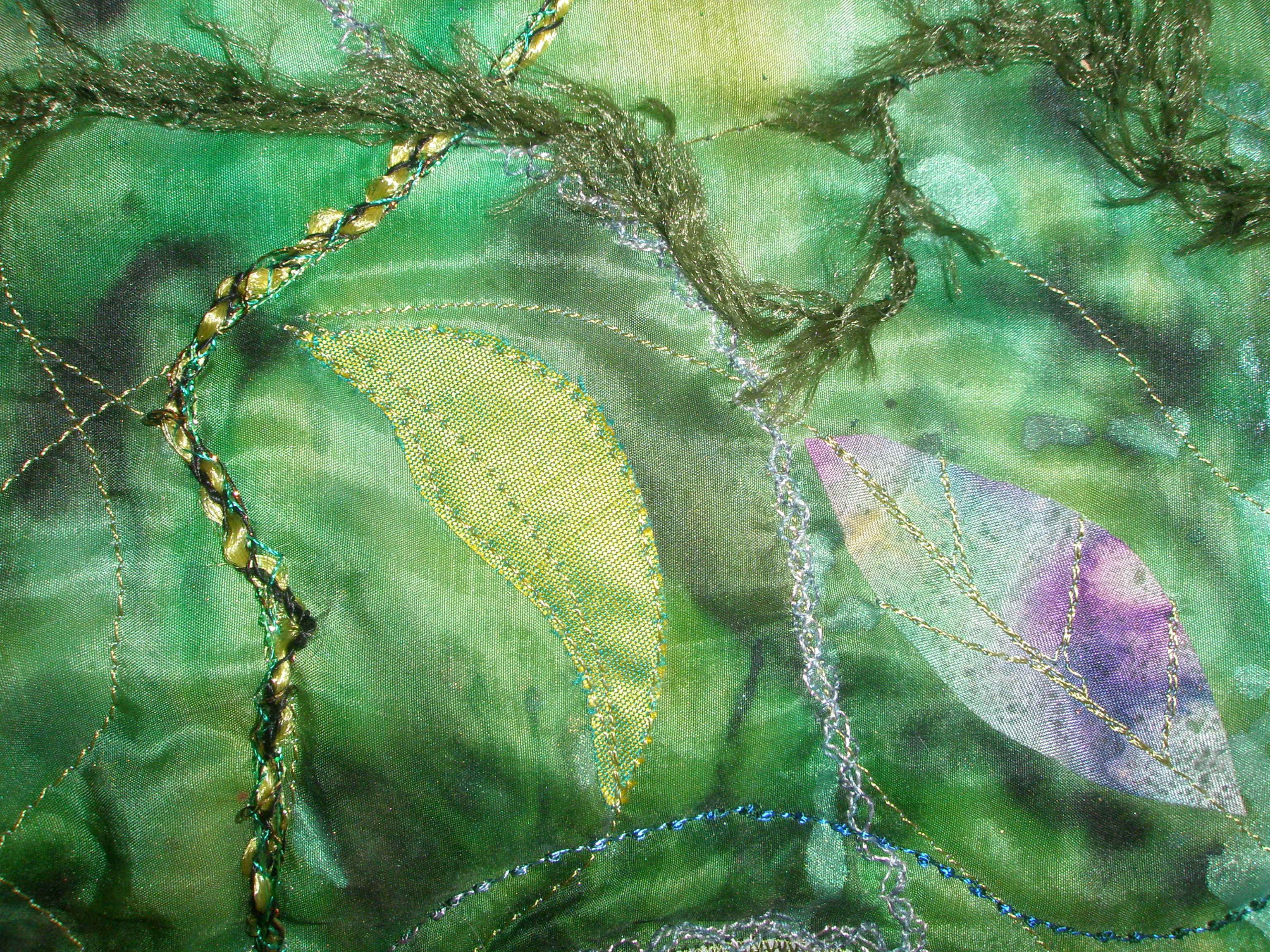 I eventually chose silk painting for the wallhanging. I loved its sensitivity and fluidity of colour. I also used a combination of different textiles to help me capture the ‘textures’ of nature.