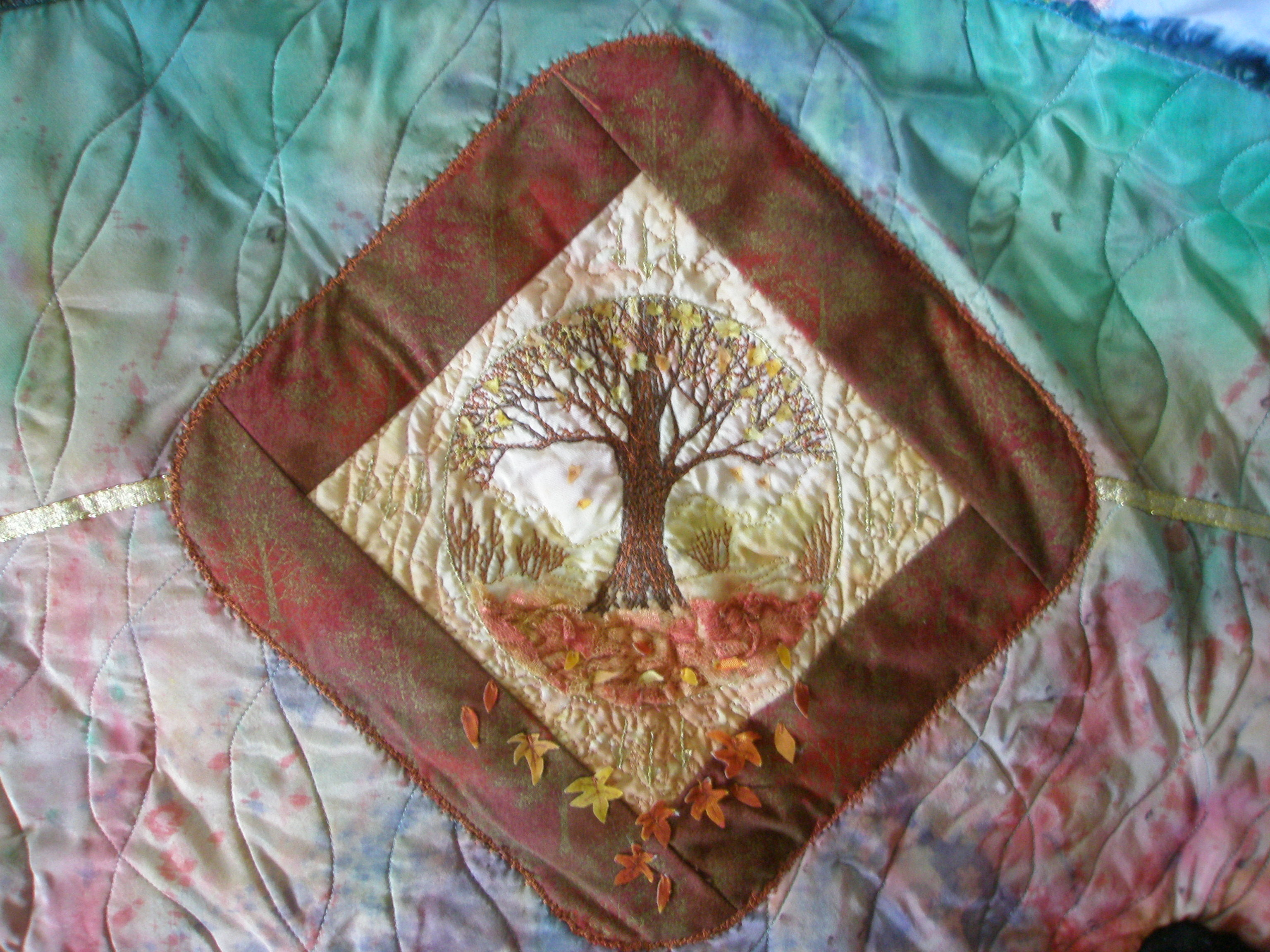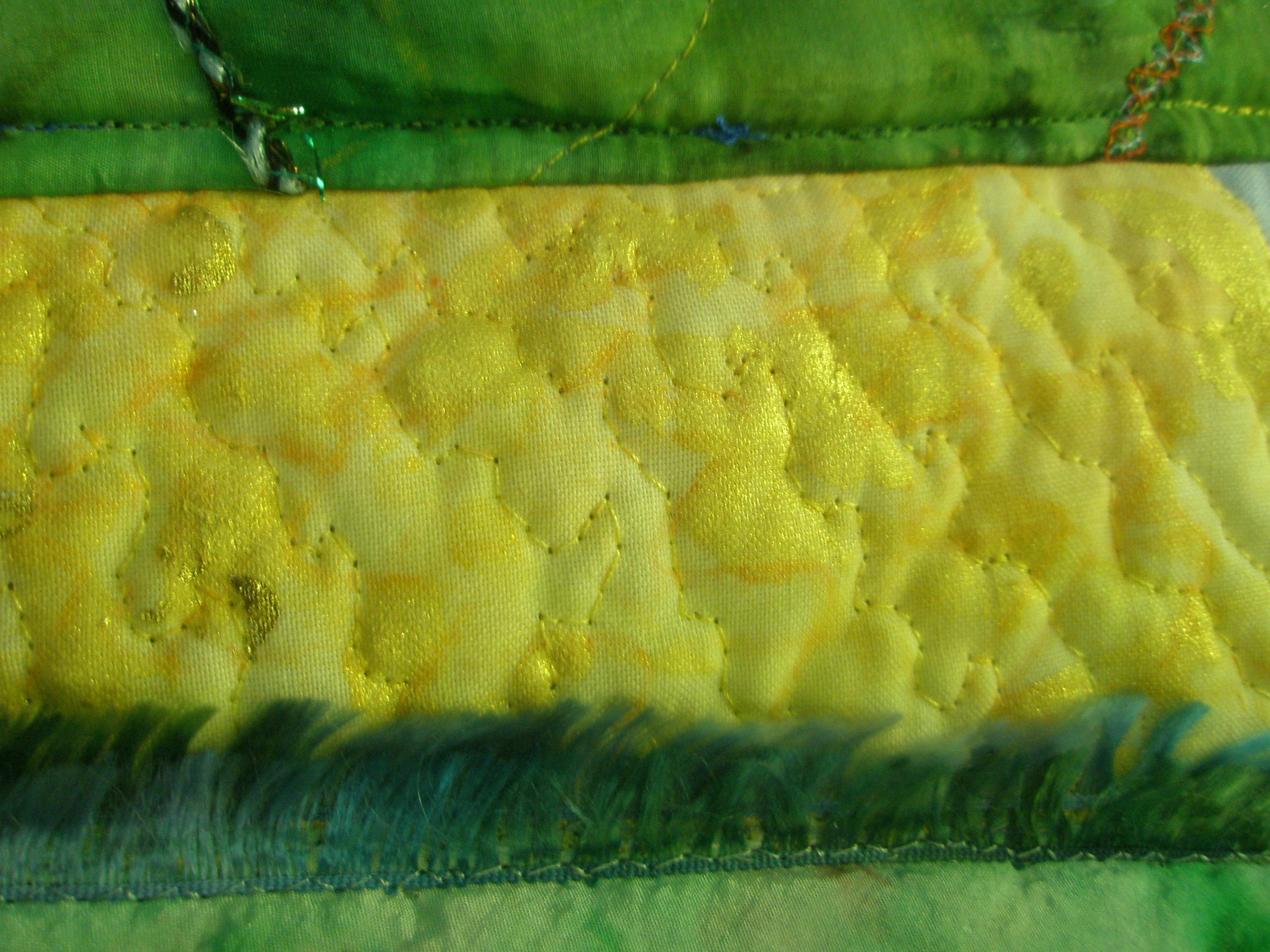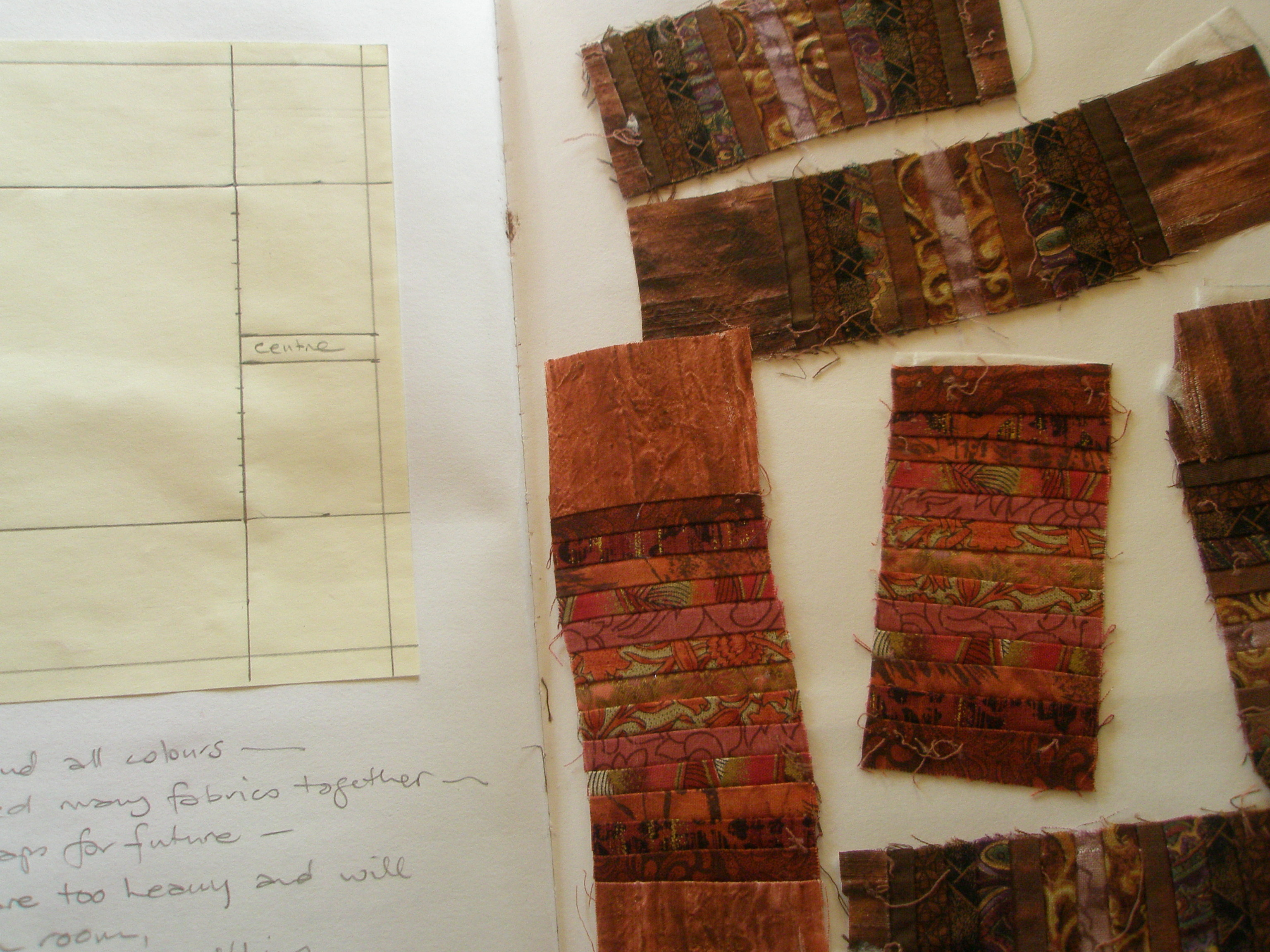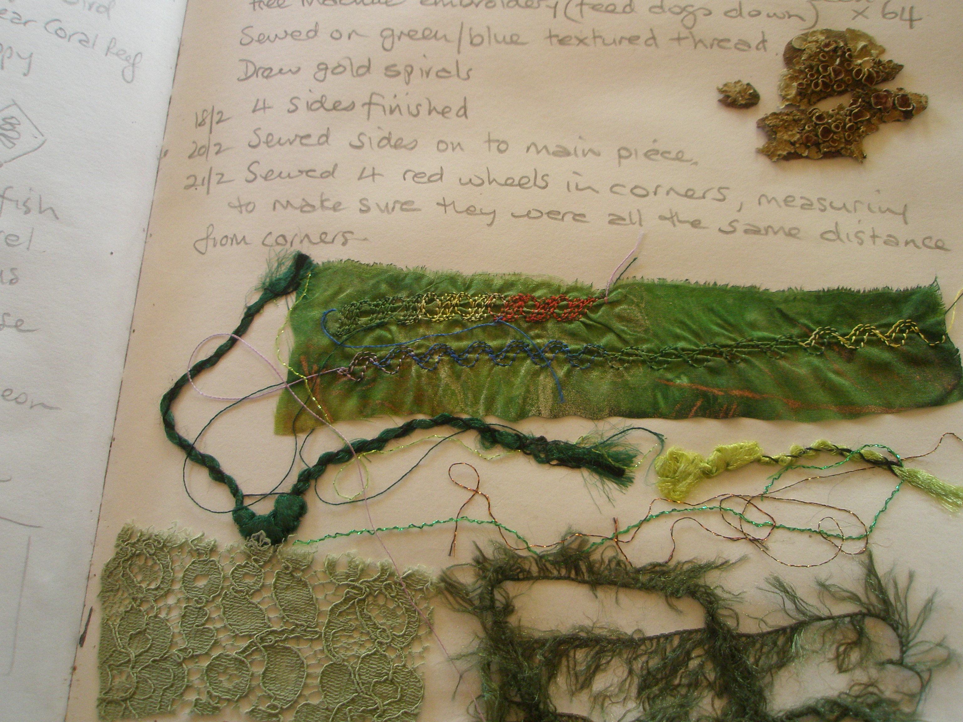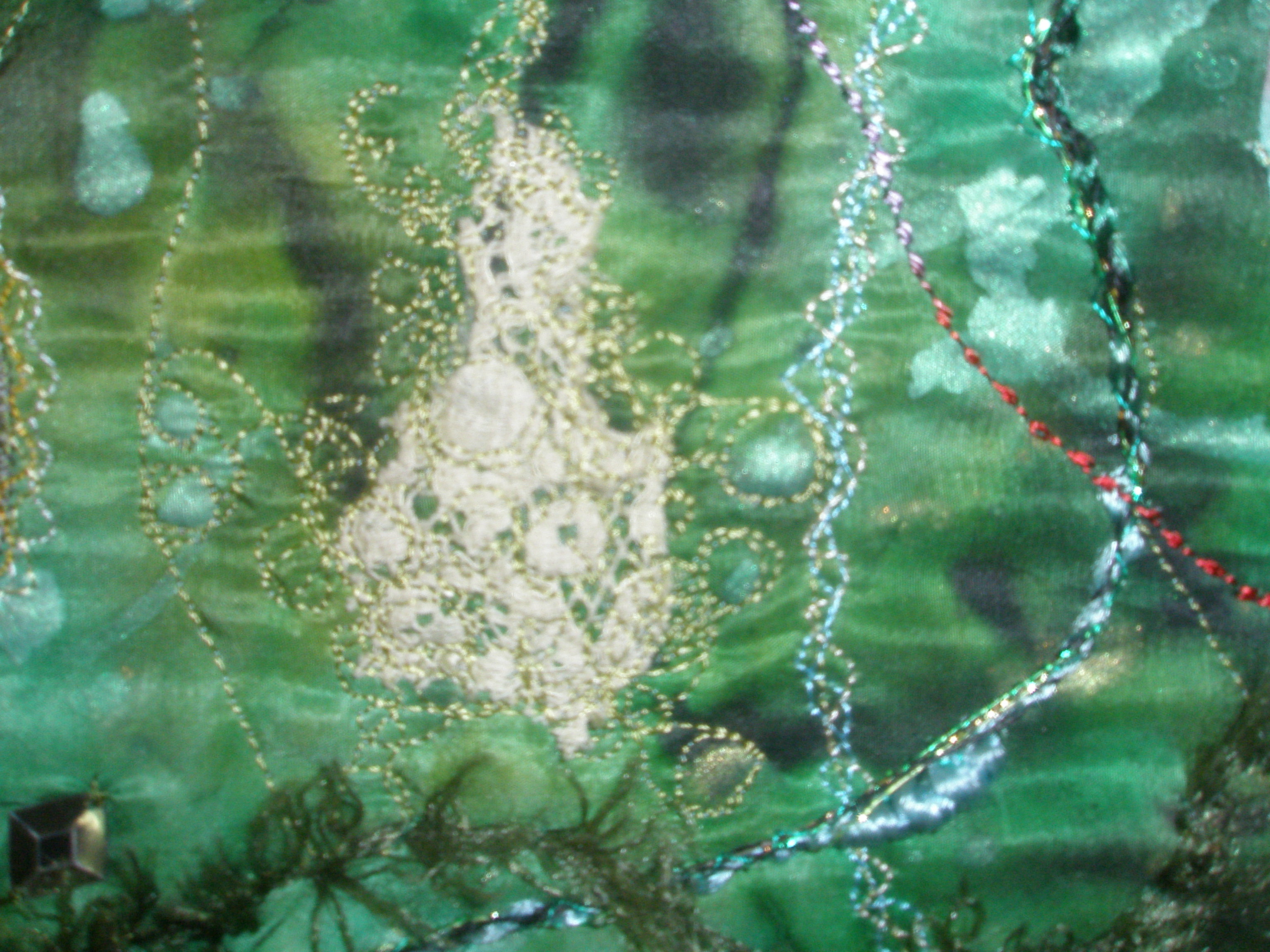 I eventually chose silk painting for the wallhanging. I loved its sensitivity and fluidity of colour. I also used a combination of different textiles to help me capture the ‘textures’ of nature.